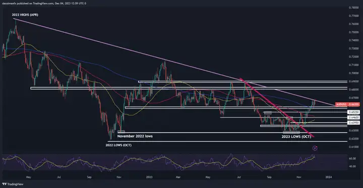 澳元/美元周一遭遇温和挫折,价格在未能突破趋势线阻力位 0.6665 后走低。如果在接下来的交易日中损失加深,主要支撑位在 0.6575 附近,200 天简单移动平均线与 2022 年和 2023 年的几个摆动低点汇合。持续的疲软可能导致重新测试0.6525。