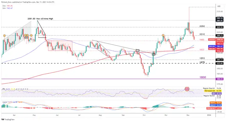 黄金在上周收盘后,本周开局表现不佳。自 10 月低谷以来,第二次重大回调似乎正在酝酿之中,现在正在测试 1985 美元的支撑位。金价在12月初飙升至历史新高后回落也就不足为奇了,最近的美元上涨帮助扩大了抛售。
