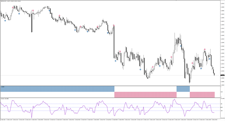 - 两个指标组成系统,分别在图表的顶部和底部生成买入和卖出信号。