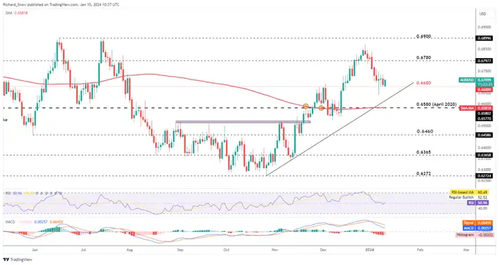 澳元/美元继续处于长期上升趋势中,但短期价格走势使该货币对走低。今天,澳元/美元似乎在明天美国 CPI 数据公布之前在 0.6680 的重要长期水平找到了盘中支撑位。如果数据比预期更热,可能会跌破0.6680,甚至重新测试上升趋势线作为支撑,而美国持续的通货紧缩可能会暂时提振澳元,这可能会使该货币对收复近期的部分损失。