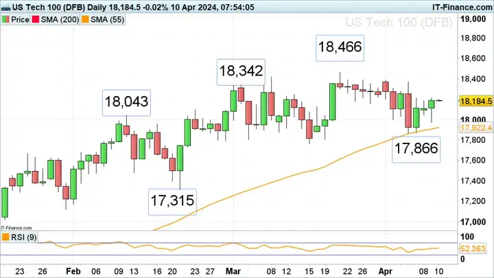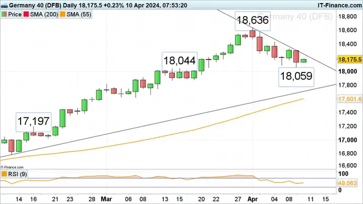 DAX 40指数周二跌至18,059点,正试图在今天美国3月CPI公布之前收复失地。多头要想重新获得控制权,需要看到周一高点18,329点上方的上涨。其下方是周五的高点18,223和4月份的下降趋势线18,252。再往上是周四的高点18,429。