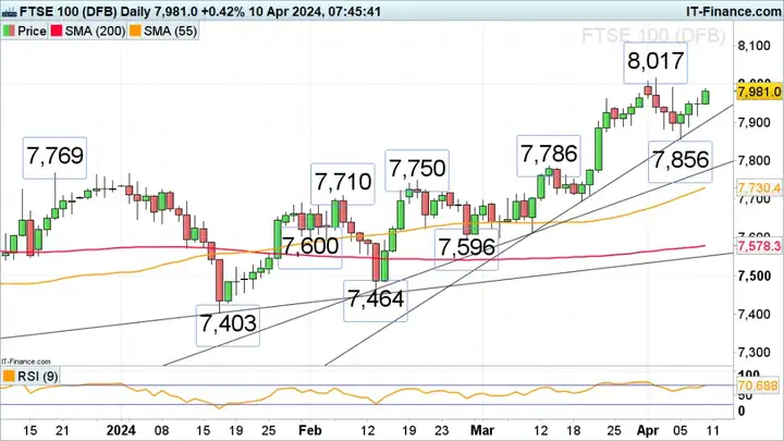 富时100指数周四试图突破8,000点大关,但未能成功,随后跌至7,856点,此后再次上涨,8,000点水平再次出现。其上方是4月初的高点8,017。