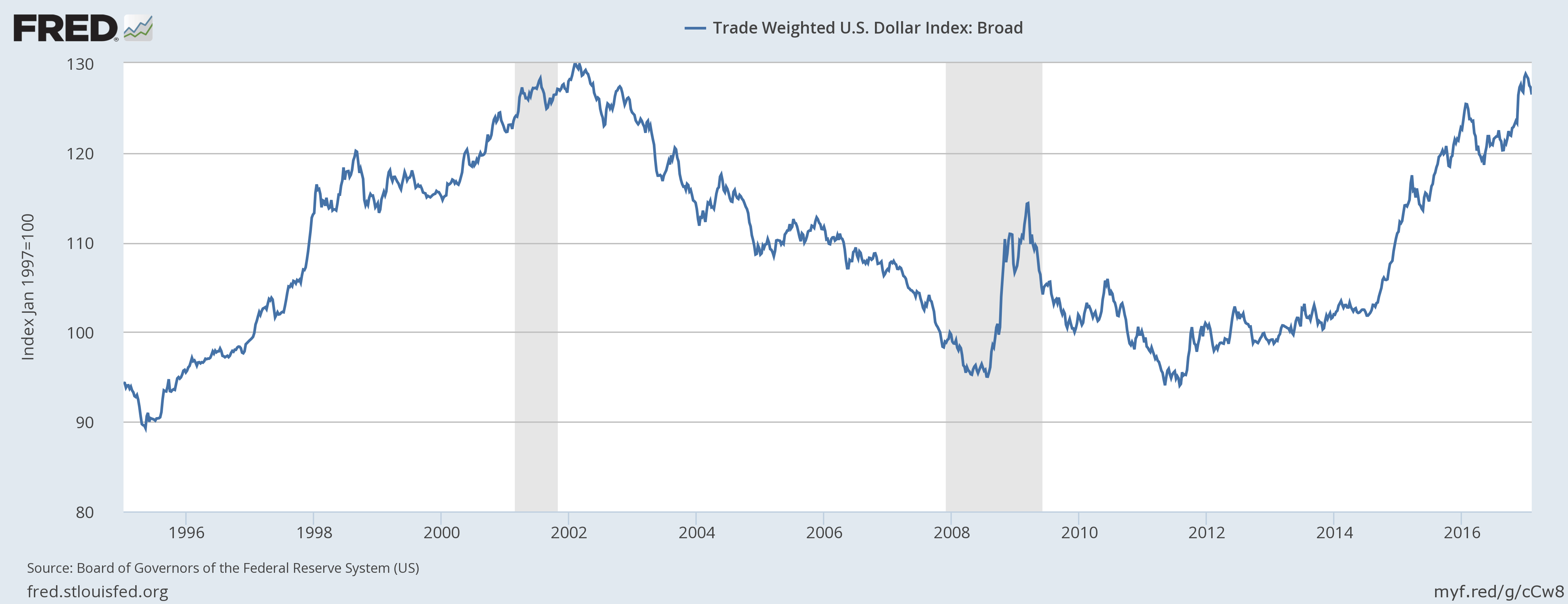 圣路易斯联邦储备银行 提供“美元兑美国主要贸易伙伴货币的加权平均值”。
