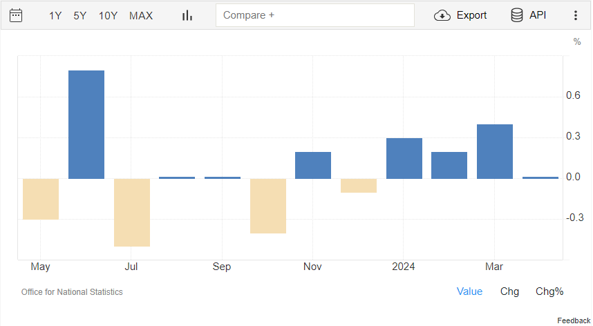 英国经济在 2023 年仅增长 0.1%,是自 2009 年以来最弱的年度增长,虽然 2024 年前三个月的增长超出了市场预期,但 4 月份的数据令人失望。