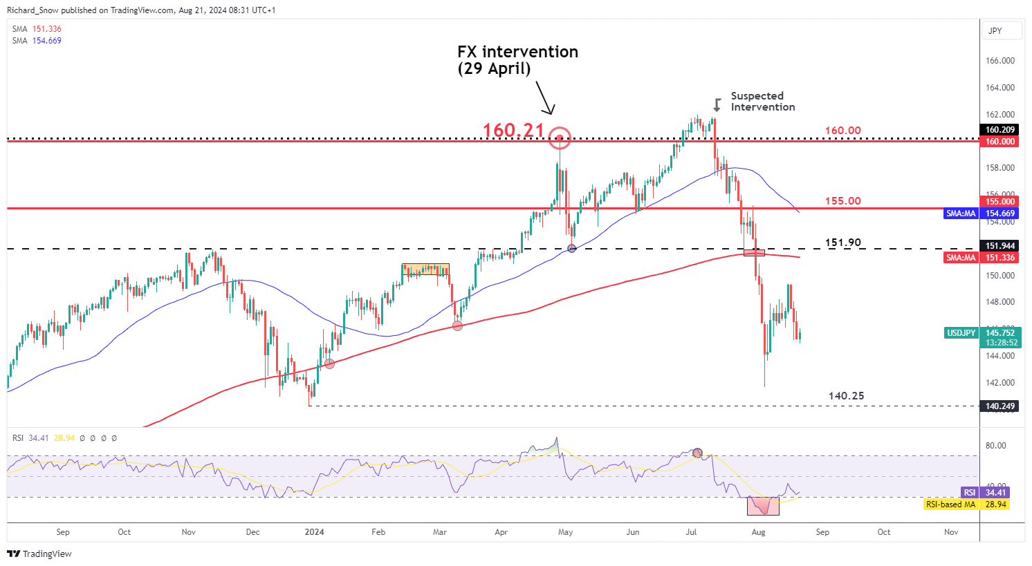 自8月5日美元/日元触及波动低点以来,尽管市场出现部分复苏迹象,但中期下跌趋势依然明显。