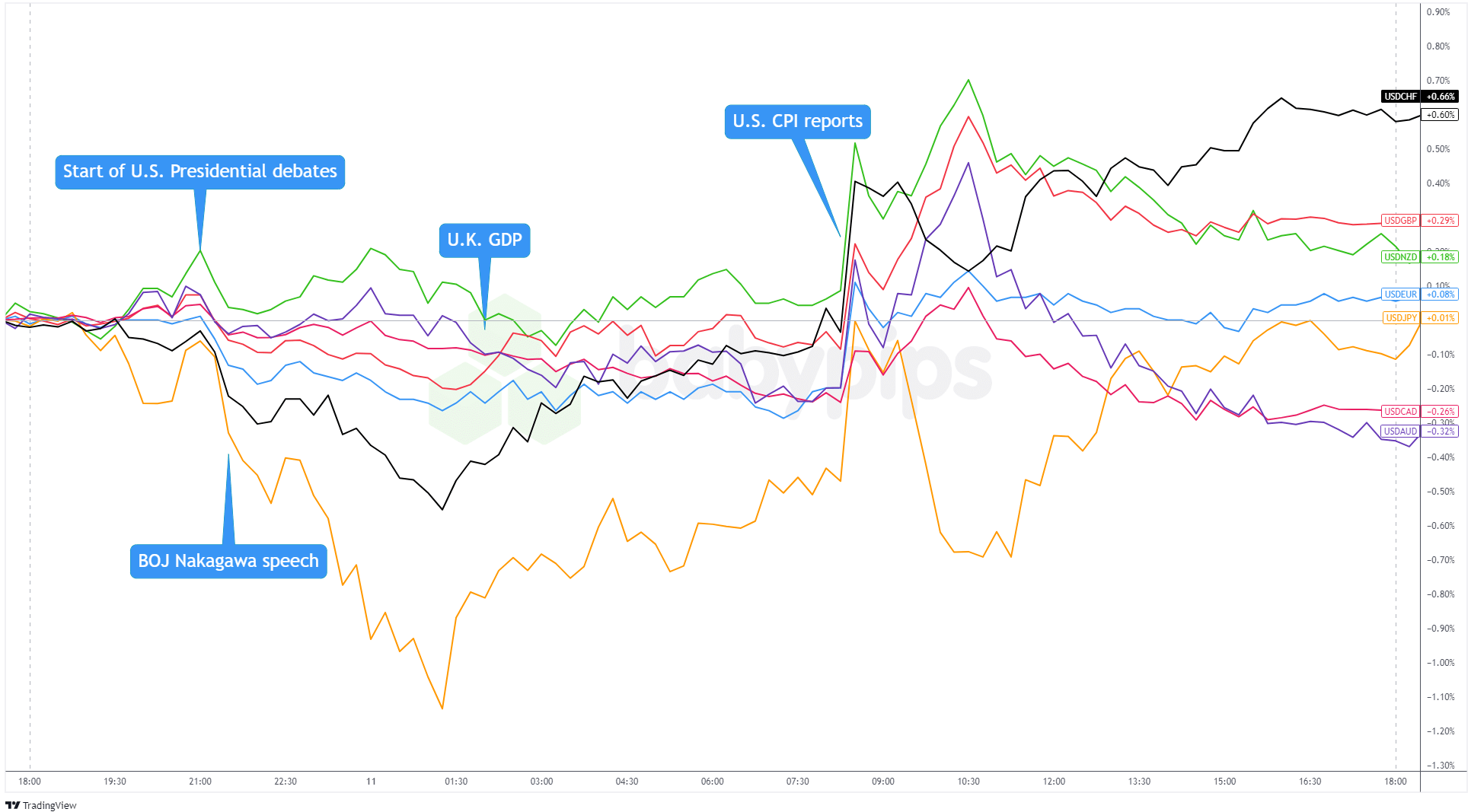 美元在当天的交易中表现出明显的波动性。受美国总统辩论和日本央行加息预期的影响,美元开盘疲软;但随后在美国CPI报告发布后短暂反弹。然而,风险偏好情绪的回归最终使美元兑避险货币扩大涨幅,而兑风险相关货币则走低。