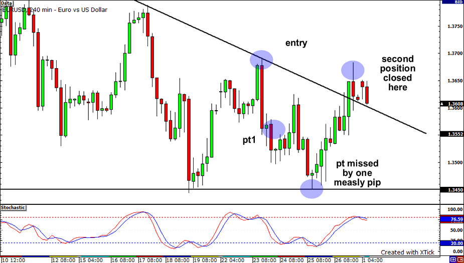第二个利润目标错失了一个点,但到那时,您已将止损移至盈亏平衡点(您进入空头的位置),因此您没有损失任何东西。