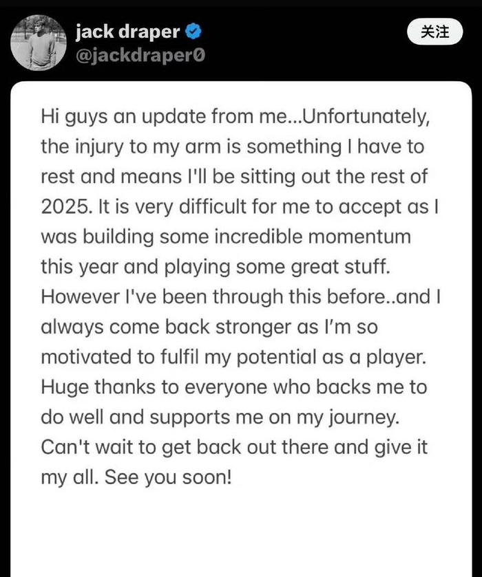 德雷珀在声明中动情地写道:“我很难接受这个事实,因为今年我正渐入佳境,状态非常好。”他还感谢了所有支持者:“非常感谢所有支持我、在我的运动生涯中为我加油的人。”