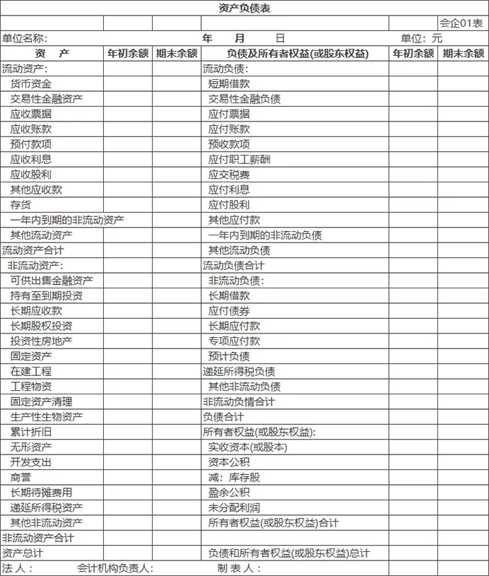 找一张空白的财务报表(例如下图中的资产负债表),对照财务报表来学习,我们要知其然,更要知其所以然会计分录也不要背诵,要理解背后的原理