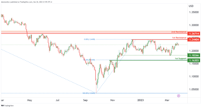这一水平可以作为一个强烈的买入兴趣区域在此之前,还有一个中间支撑位1.1826,如果价格从当前水平下降,这个支撑位可以作为回调支撑位在阻力位方面,第一个阻力位在1.2440,这是一个震荡高阻力位如果价格从目前的水平上升,在这个水平上可能会面临抛售压力。