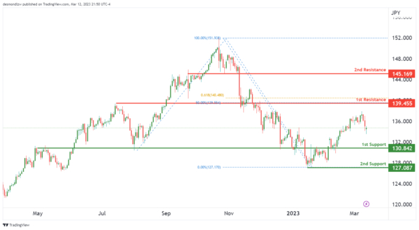 (英镑/美元走势图 来源:IC Markets)美元/日元美元/日元徘徊在第一个支撑位130.84和第一个阻力位139.45(50%斐波那契回撤位)之间,如果突破第一个阻力位,该货汇正财经投诉电话币对可能会上升到第二个阻力位145.16。