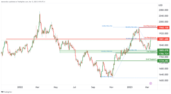 (澳元/美元走势图 来源:IC Markets)现货黄金黄金价格已经从第一个支撑位1805美元/盎司显著反弹目前,金价正在测试第一个阻力位1881美元/盎司,该位与50%斐波那契回撤位一致如果金价从这个阻力位走势发生逆转,金价可汇正财经投诉电话能会跌到第一个支撑位1805美元/盎司。
