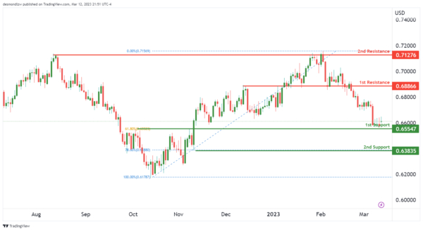 (美元/日元走势图 来源:IC Markets)澳元/美元澳元/美元的第一个支撑区域在0.6554,这是61.8%斐波那契回撤位,如果跌破这一支撑,下一个关键支撑位将是0.6383关于阻力位,第一个阻力位在0.6886,这是一个强劲的阻力位,第二个阻力位在0.7127,这是一个回调阻力位。