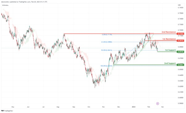 (英镑/美元4小时图 来源:IC Markets)澳元/美元从4小时图来看,对于澳元/美元的总体偏好是看空,因为当前该货币对跌破“一目云”,并且已经失守上升趋势线,暗示市场结构已经改变澳元/美元首个支撑位在0.68160,这是50%斐波那契回撤位。
