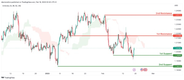 (美元/日元4小时图 来源:IC Markets)英镑/美元从4小时走势图来看,对英镑/美元的总体偏好是看空,因为目前该货币对跌破“一目云”,这表明前景看空如果看空动能持续,预计英镑/美元会跌向首个支撑位1.19609, 这是最近的波动低点,然后料跌向第二个支撑位1.18410,这是之前的波动低点。