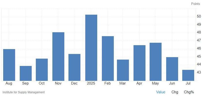 ISM调查:两大关键商业调查的就业分项指数均发出了警报7月份ISM制造业就业指数已降至43.4,而规模远大于制造业的服务业,其ISM服务业就业指数也降至46.4任何低于50的读数都意味着该行业就业正在收缩。