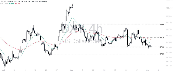 DXY震荡下行,在97.60支撑位上方盘整发散的均线进一步强化了偏空倾向若DXY在97.60上方反弹并突破98.20,指数有望上测下一个阻力99.00相反,若跌破97.60,EURUSD可能走弱,下探下一个支撑97.20。