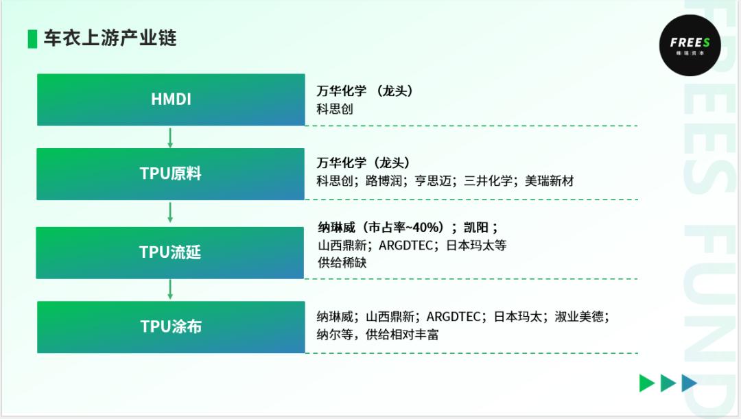 流延的难度在于,将TPU粒子融化后,通过膜头挤出的过程中,液体在膜头内的压强不均匀,导致挤出的基膜难以实现厚度的高度统一更上游的HMDI和TPU粒子,我国化工巨头万华化学也在近年来实现了国产替代,目前万华化学已跻身国际头部的HMDI和TPU粒子的生产商。