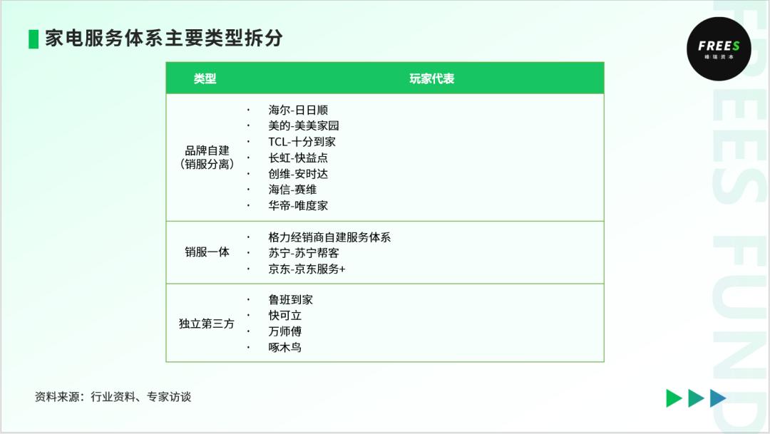 家电公司往往会成立一家服务公司,专门组织这些授权服务网点,如:美的-美美家园,TCL-十分到家等汇通财经手机软件下载安装官网等此外,零售渠道也会自建服务网络,如:格力将售后维修全部交给经销商,苏宁-苏宁帮客,京东-京东服务+
