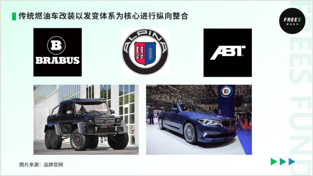 前装改装 主要指,在主机厂的量产车基础上进行定制化&个性化升级,并推出限量车型 传统燃油车改装以发动机、变速箱为核心进行纵向整合, 改装厂牌与主机厂深度绑定,改装厂牌的话语权较弱比较典型的前装改装厂牌包括:巴博斯(改装奔驰),阿尔宾纳(改装宝马),ABT(改装奥迪)等等。