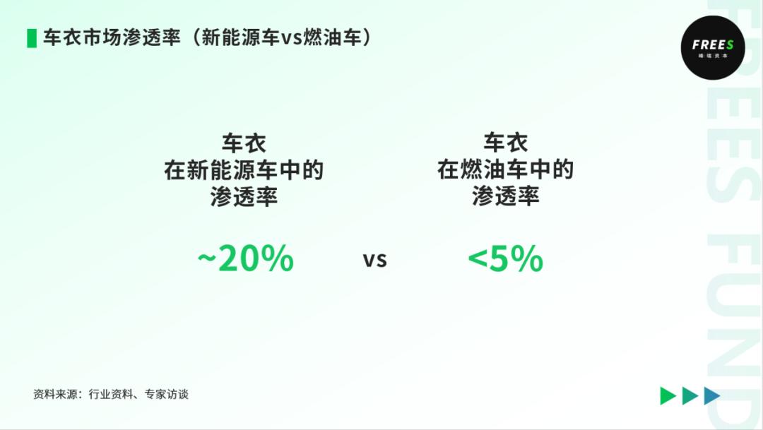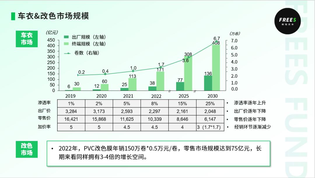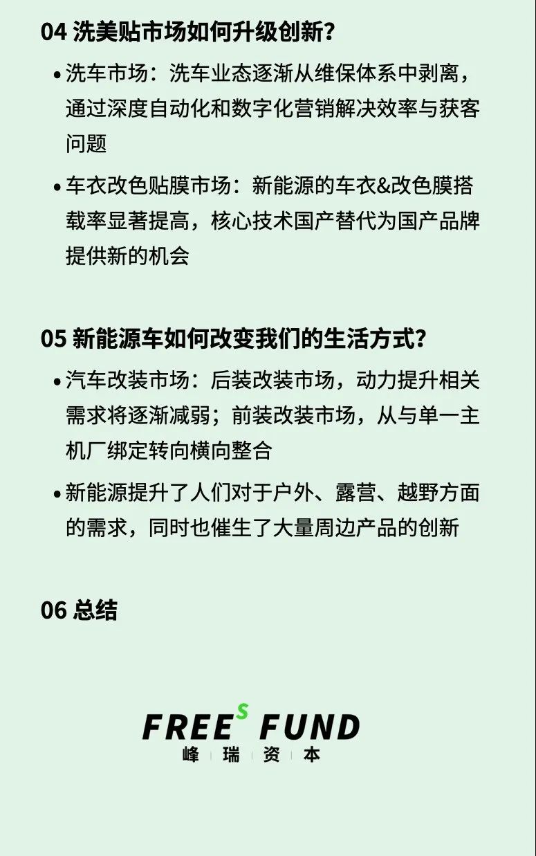 随着新能源车保养需求的缩减, 洗车业态可能逐渐从维保业态的附属中剥离,进而需要解决独立经营的盈利性(获客和运营效率)的问题 我们看到,一些创新玩家在通过高度自动化来提升效率 新能源的车衣&改色膜市场 存在巨大增长空间,比如:上游供应链实现技术突破,在原料和产品层面实现国产替代;下游品牌在产品形态上有更多创新,改善销售履约体系,实现国货崛起。