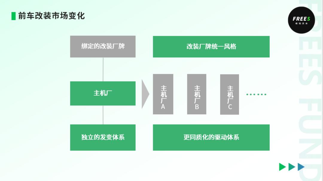 新能源车驱动体系有同质化的特征 传统燃油车主机厂大多都是内燃机技术的推动者,新能源主机厂则更接近产品定义公司因此,在新能源前装改装市场 存在横向整合的可能性, 改装厂牌通过统一的风格和底盘调教,针对不同的主机厂推出定制化产品,形成脱离于主机厂的品牌。
