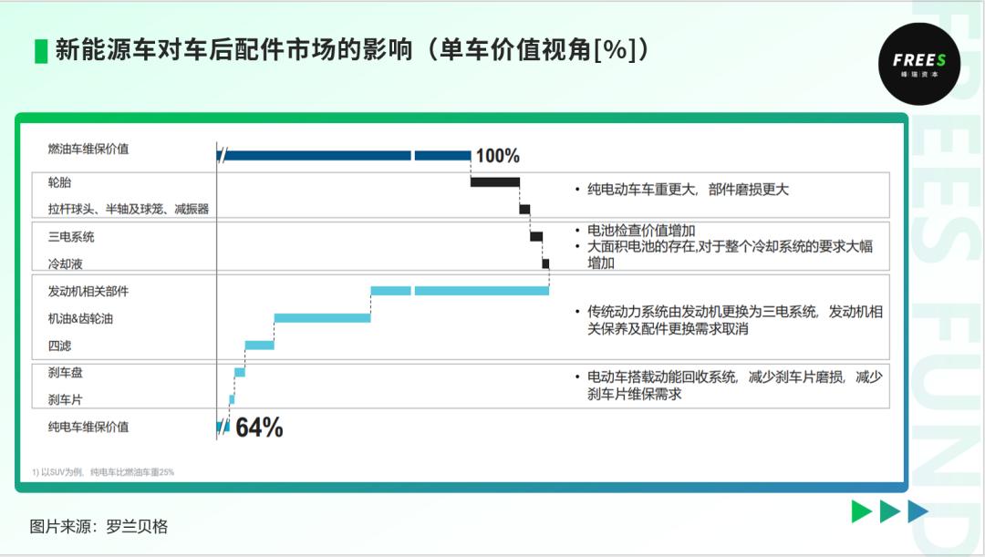 由于新能源车的零部件与燃油车不同,车辆的保养、易损、维修、事故四类市场需求也会随之发生显著变化首先,由于动力总成不同, 新能源车对机油、机滤的保养需求将几乎消失 而这部分需求原先则占到传统燃油车保养市场的近一半。