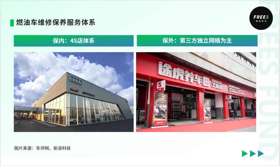 上文我们分析了新能源车将对维修保养市场需求和配件流通体系产生的影响这两方面的变化进而会共同影响维修保养的终端业态燃油车维修保养由两大体系构成:保内(产品在保修期内和在保修范围内)的4S店体系主导、保外(产品已过保修期或故障不在保修范围内)以第三方独立网络为主导。