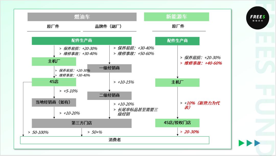 第二个变化是,随着流通体系的精简,各环节的加价率也在降低燃油车在维保时,4S店对零部件的加价率通常会达到1倍甚至数倍,显著高于街边的社会化门店而目前,部分新势力主机厂对门店的配件加价率很低,同时,部分新能源车的4S店/授权门店,可以将配件加价率压到20%-30%的水平,显著低于燃油车4S店。