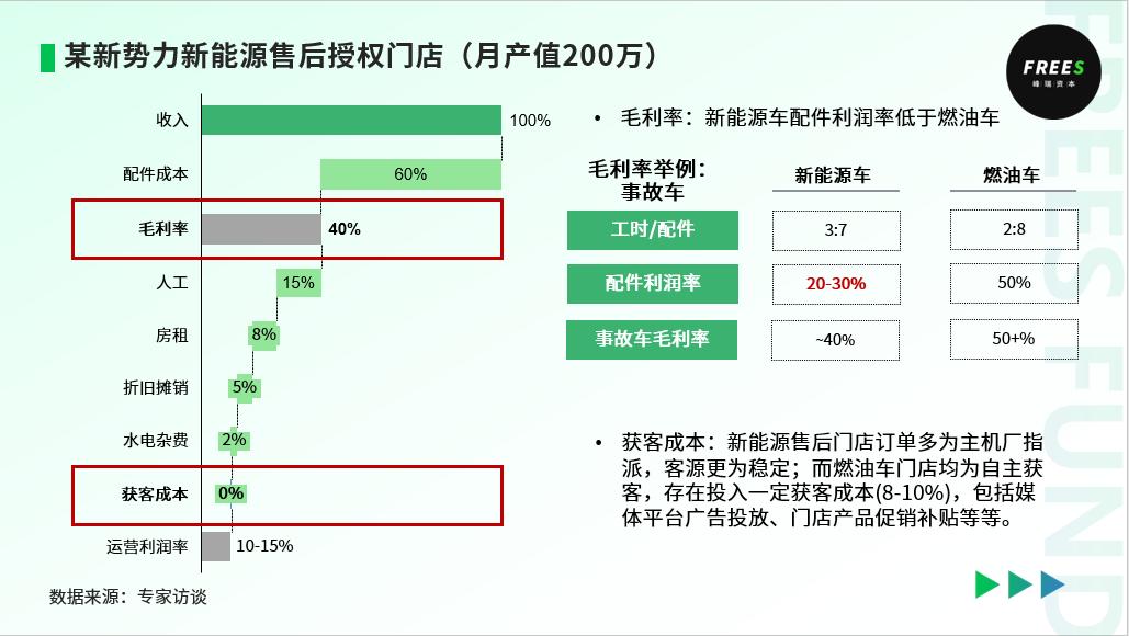 以下图某家新能源售后授权门店为例。这家门店的毛利率约为40%,比传统燃油车售后店约50%的毛利率有所下降。但由于新能源售后门店节约了获客成本,仍能保持相对不错的门店利润。
