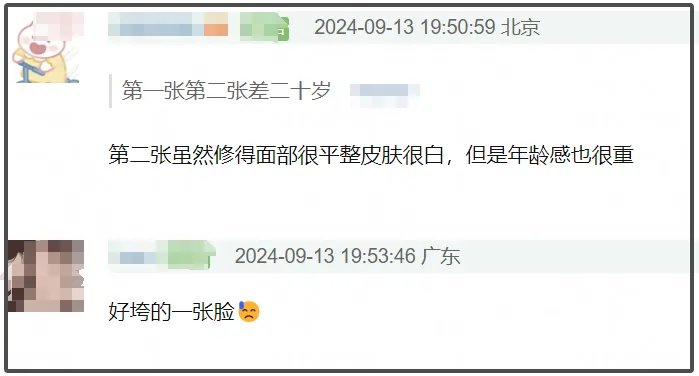 有网友怀疑她这是做了医美,保质期过了导致的脸垮,侧脸看鼻尖也有些怪异,鼻翼旁的法令纹也很深。