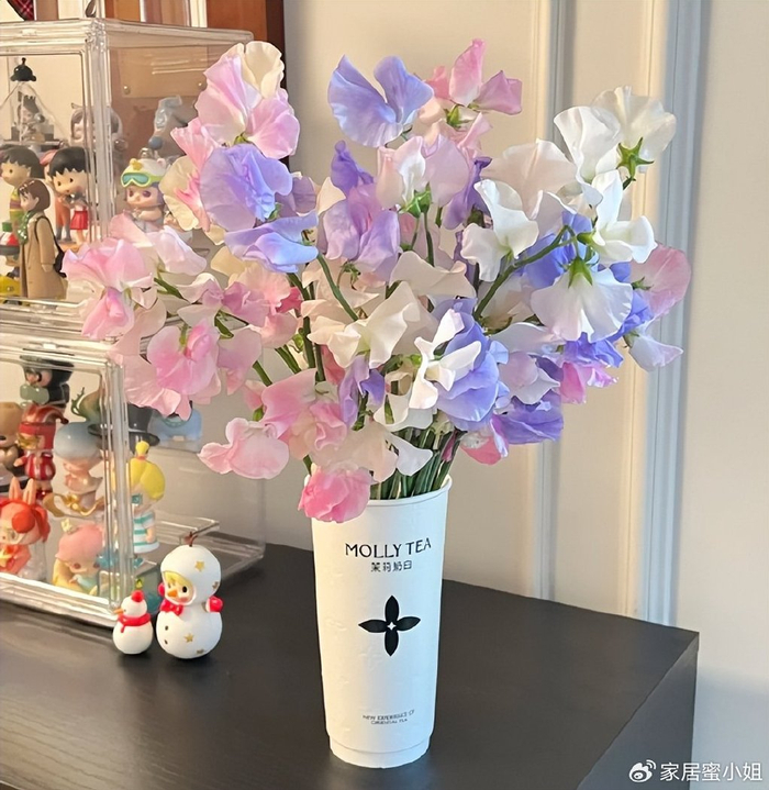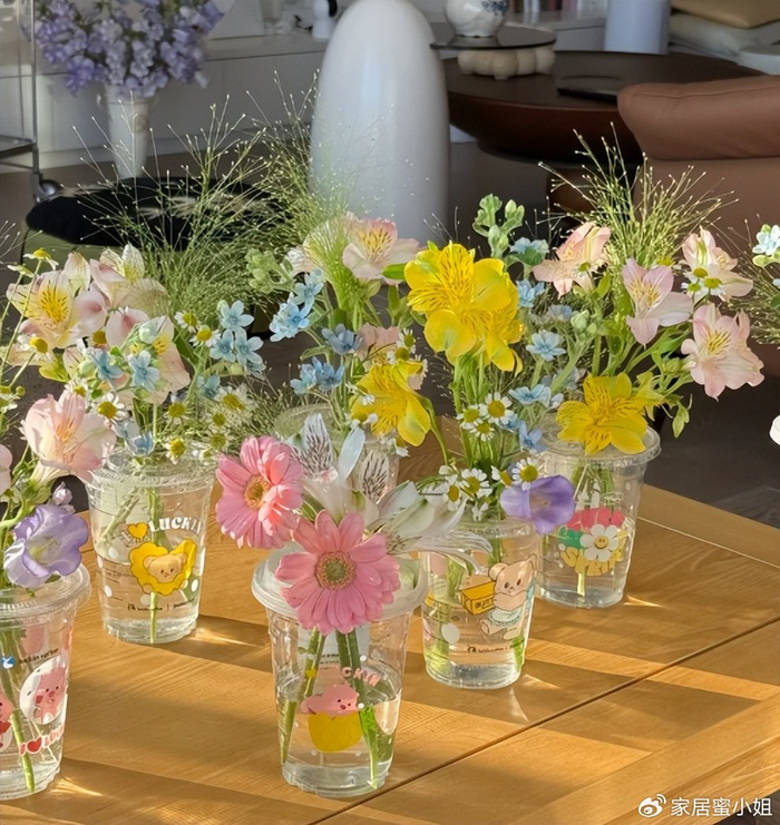 在奶茶杯子里面装点水,再把鲜花插进去,一个不花钱的花瓶就做好了。平时用它插鲜花,摆放在家里各个角落,真的很好看,也有氛围感,最重要的是,不花钱啊。