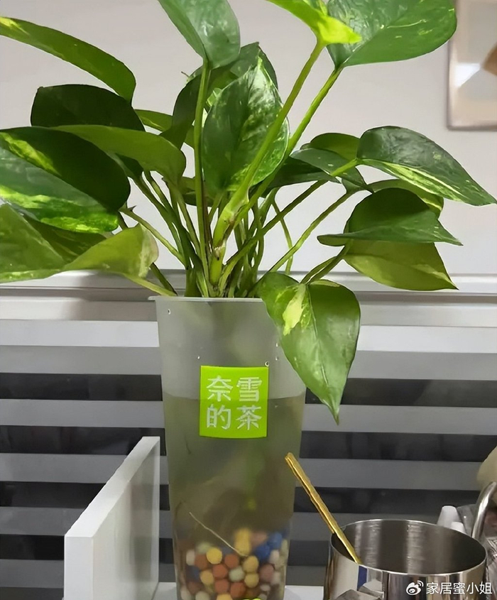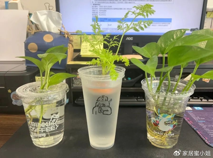 平时在工位上养绿植,真的没必要买什么花瓶,少说也得几十块钱,平时喝完的奶茶,水洗一下,装点水,植物往里面一插,这不就是妥妥的水培吗!