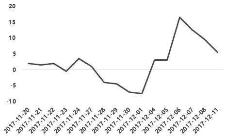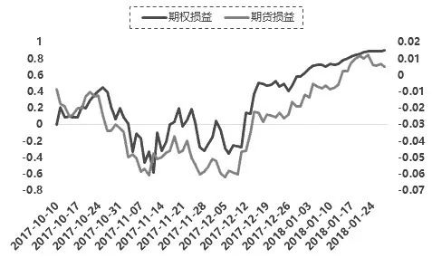 假如投资者预期2017年12月的USDA报告会造成期权价格的大幅波动或者隐含波动率的大幅上涨,于是预先买入M1805-C-3000和M1805-P-2650组合,以11月20日的收盘价28.5元/吨作为买入成本,以日收盘价作为每日的结算数据,对持仓期间的损益进行回顾,我们可以发现在持仓的前半个月,组合一直处于浮亏的过程中,只有在临近报告日,组合的损益才开始上涨。