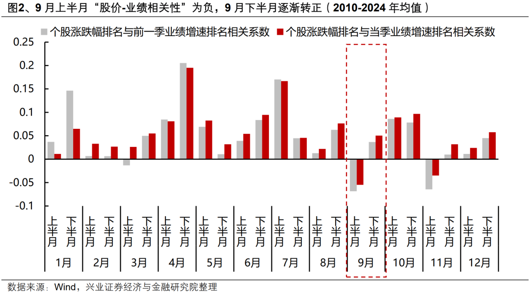 2. 9月上半月市场倾向于交易预期,下半月业绩影响开始提升景气投资有效性与业绩披露期密切相关业绩披露期间,业绩与股价表现相关性较强,例如每年的4月(年报和一季报)、7月(中报预告)、10月(三季报)而业绩披露告一段落后,市场则会更倾向于进入想象力审美的模式中,典型如9月上半月(中报披露完毕)和11月上半月(三季报披露完毕)。