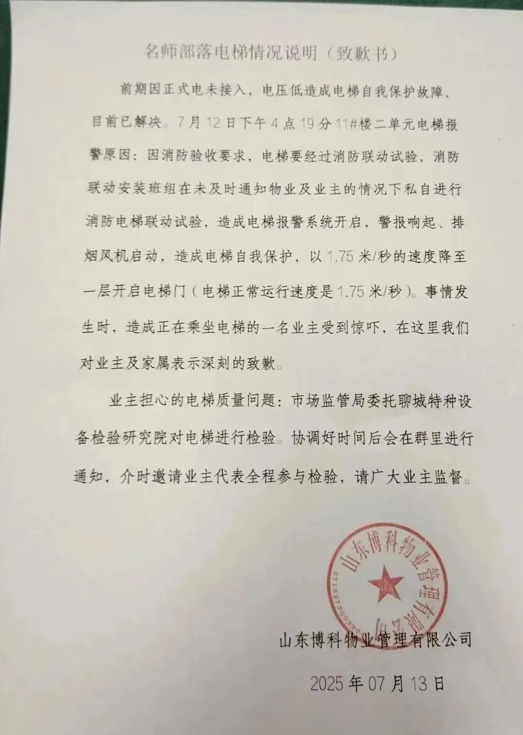 ”楼道间还响起了警报声记者了解到,事发时间为7月12日下午4点19分,事发电梯位于名师部落11号楼二单元7月13日,山东博科物业管理有限公司发布《名师部落电梯情况说明(致歉书)》,称:“前期因正式电未接入,电压低造成电梯自我保护故障,目前已解决。