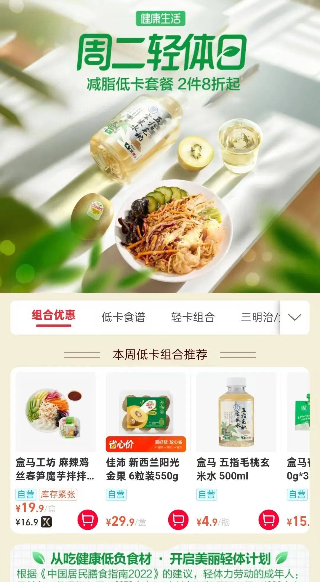 盒马推出的周二轻体日活动,在这一天对减脂低卡套餐集中组合营销,不仅有组合优惠,还有低卡食谱、轻卡组合、0糖水饮、低GI碳水等打包方案,让消费者可以快速根据自汇通财经官方网站首页下载安装手机版身需求锁定产品,由此在社媒平台上还衍生出许多7天盒马减肥法,进一步在消费者心中锚定低卡印象。