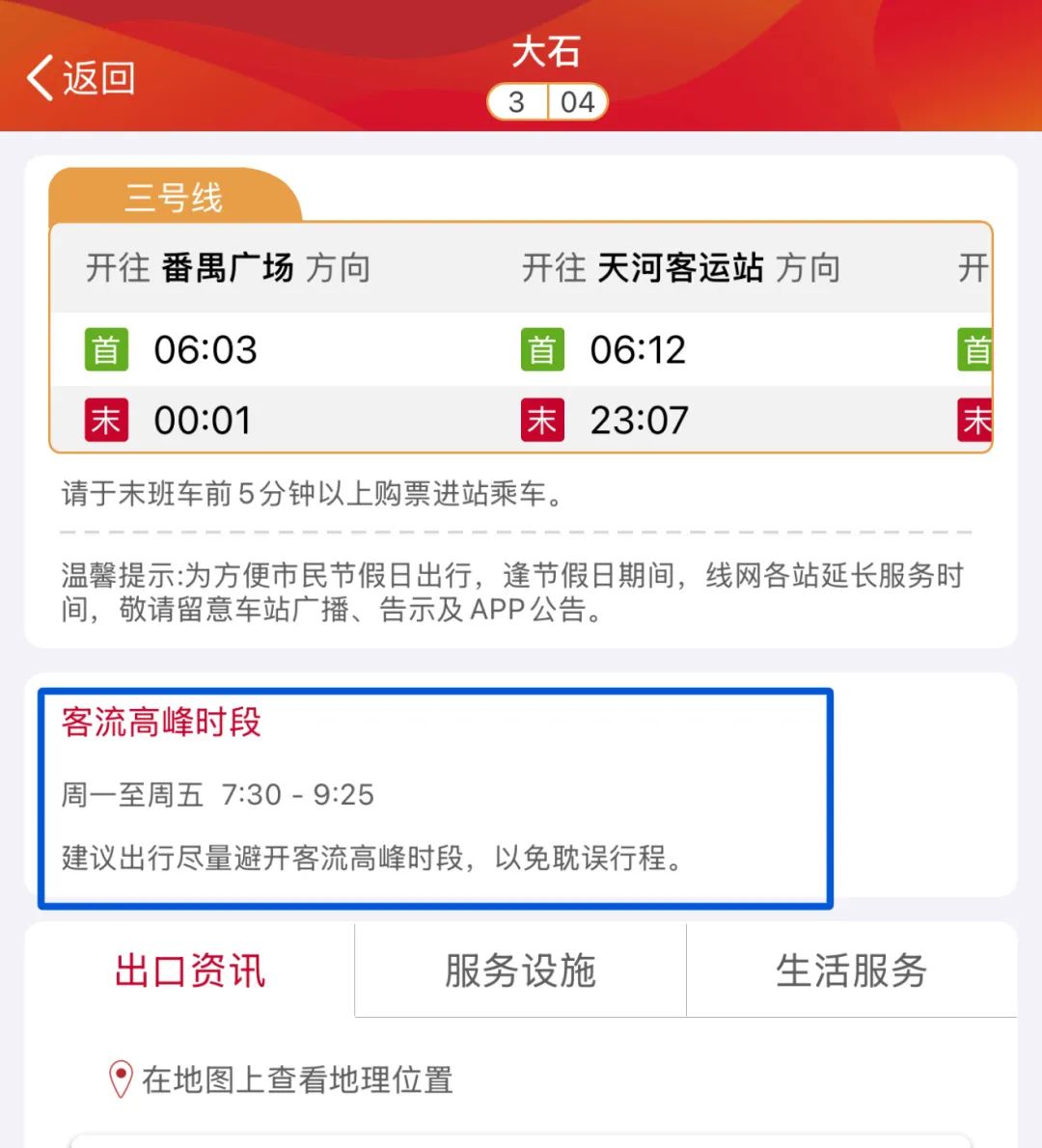 下载广州地铁官方APP,线网图中选择需要查询的站点,查看车站信息,就可以看到该站的客流高峰时段啦例如大石站的客流高峰时段为7:30-9:25