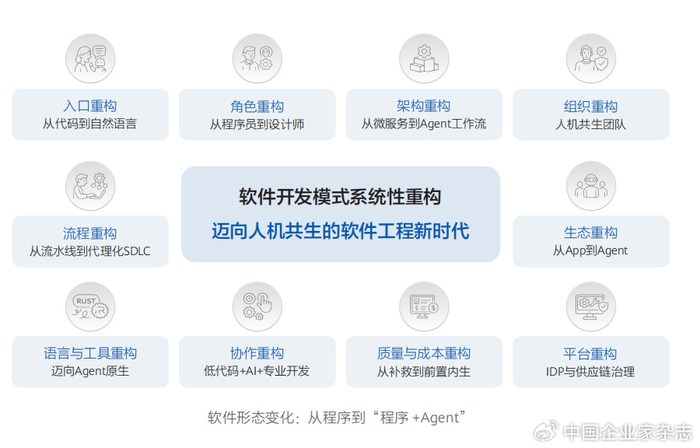 软件开发模式重构的本质是“智能化与治理的平衡”,未来十年的软件工程并不是单纯的“AI代替人类”而是人类与智能体的协同模式:AI承担执行与自动化,人类负责设计、治理与价值判断,Agent智能化开发与治理并重。