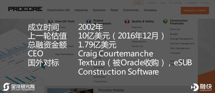 Procore Technologies是一家基于云的建筑项目管理软件供应商,可以使承包商、设计师、工程师以及开发人员在项目全程保持实时联系,建筑企业可以利用其软件创建报价、处理预算、修改蓝图以及监督项目实施。