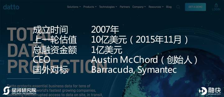 Datto为企业提供数据恢复服务,自主开发设计的硬件和软件设备能够以最高每5分钟一次的频率,对一家公司的全部信息技术系统进行快速备份这套系统安置于客户的经营场所和Datto的云端,在企业遭受黑客攻击后,客户可以十分方便的获取备份,并且可以从任何地点进行数据恢复。
