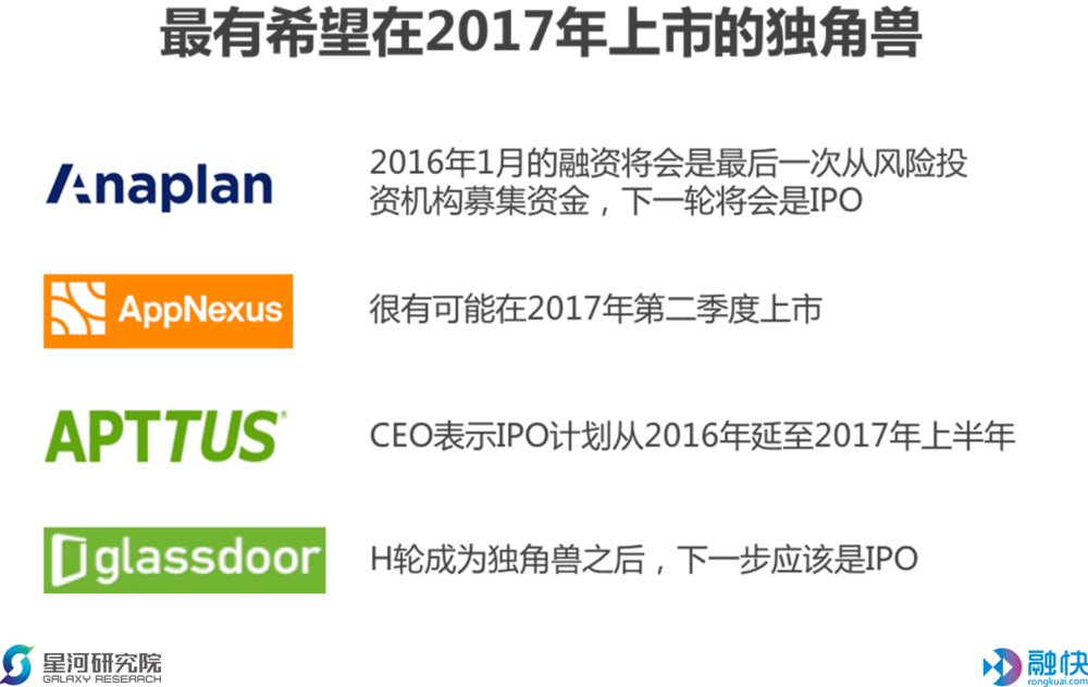 基于国外权威创投机构的分析和一些海外信源、以及对公司本身的经营情况、细分领域的发展状况和竞争情况等的分析,我们判断,今年上市希望较大的几个独角兽分别是Anaplan、AppNexus、Apttus和Glassdoor。