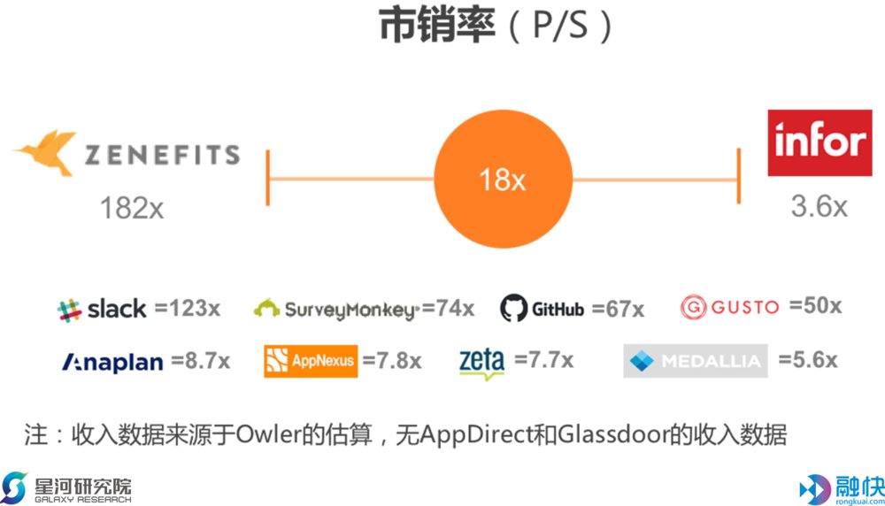 市销率最高的是Zenefits,最低的为Infor,中位数为18。像Zenefits、Slack等这样的独角兽估值虽然很高,但收入还远未达到预期。