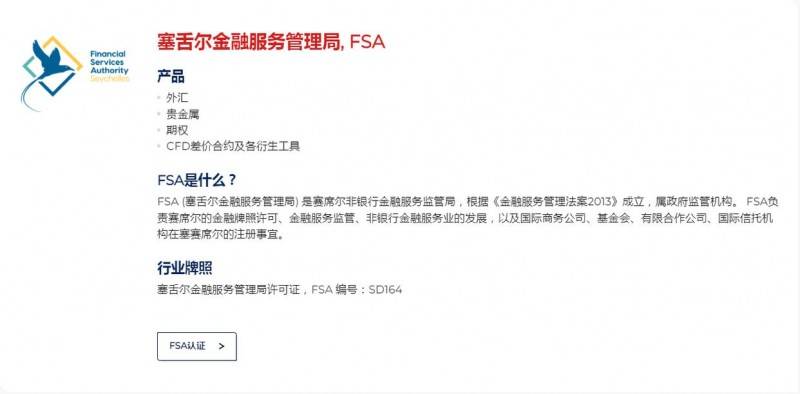 亨达国际塞舌尔FSA监管 FSA (塞舌尔金融服务管理局) 是赛席尔非银行金融服务监管局,根据《金融服务管理法案2013》成立,属政府监管机构 FSA负责赛席尔的金融牌照许可、金融服务监管、非银行金融服务业的发展,以及国际商务公司、基金会、有限合作公司、国际信托机构在塞赛席尔的注册事宜。