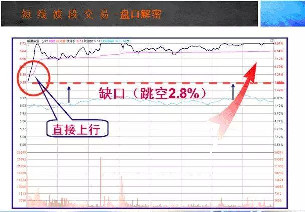 特别提示:  在有跳空缺口的开盘中,开盘后有没有立刻回补缺口的动作以及该动作的力度大小,是 全天走势方向是否明朗的重要标志  如果跳空开盘后没有任何回补动作,那么全天的股价走势必然会沿着跳空的方向运行