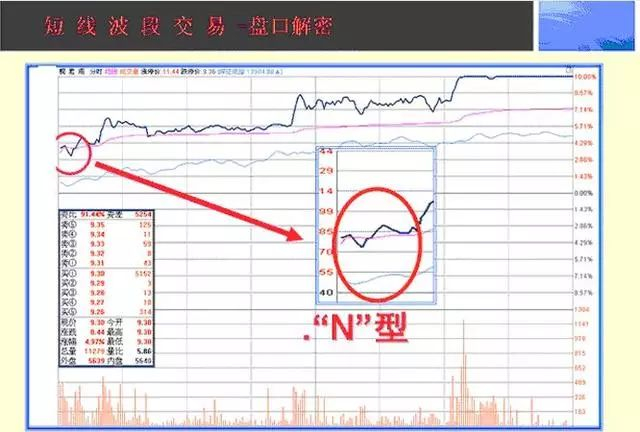 强势上攻的两种形态:  A.“N”型走势:即开盘后股价快速上冲后又快速回落,随即又快速上冲,分时图上呈现一个 “N”字型走势——说明开盘后股价遭遇抛压,但随即又被买盘托起,显示多头力道强大,当日看涨