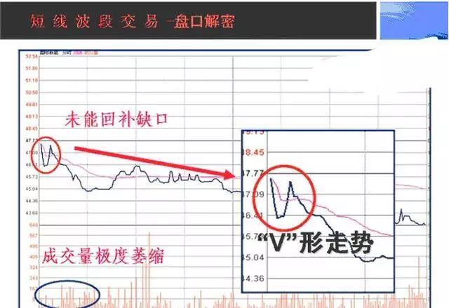 2.强行出货形态:  即低开后股价继续低走,或快速上冲到缺口附近再次回落,没能回补缺口,形成一个“V”形或倒“V”形走势,成交量呈现极度萎缩或极度放大之势,内盘是外盘的一倍以上,此种开盘全天看跌;