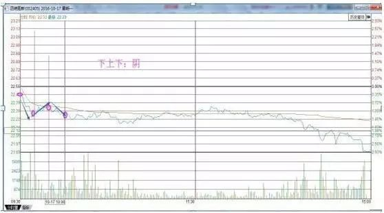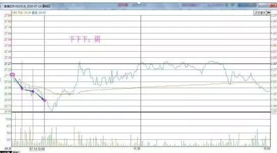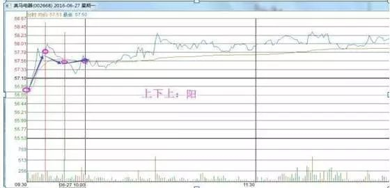 c、若第三个十分钟高于(低于)第二个十分钟的点位,则为第三次上(下)。  在前三十分钟中,两次以上的“上”则应收阳线,两次以上的“下”则应收阴线。