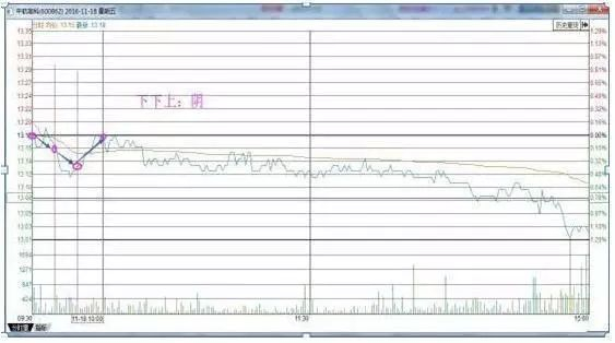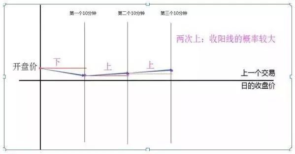 c、若第三个十分钟高于(低于)第二个十分钟的点位,则为第三次上(下)。  在前三十分钟中,两次以上的“上”则应收阳线,两次以上的“下”则应收阴线。