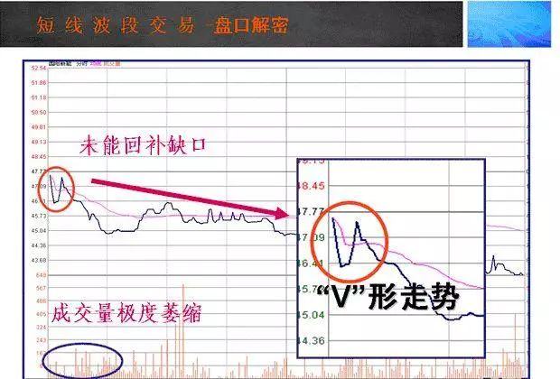 2.强行出货形态:  即低开后股价继续低走,或快速上冲到缺口附近再次回落,没能回补缺口,形成一个“V”形或倒“V”形走势,成交量呈现极度萎缩或极度放大之势,内盘是外盘的一倍以上,此种开盘全天看跌;